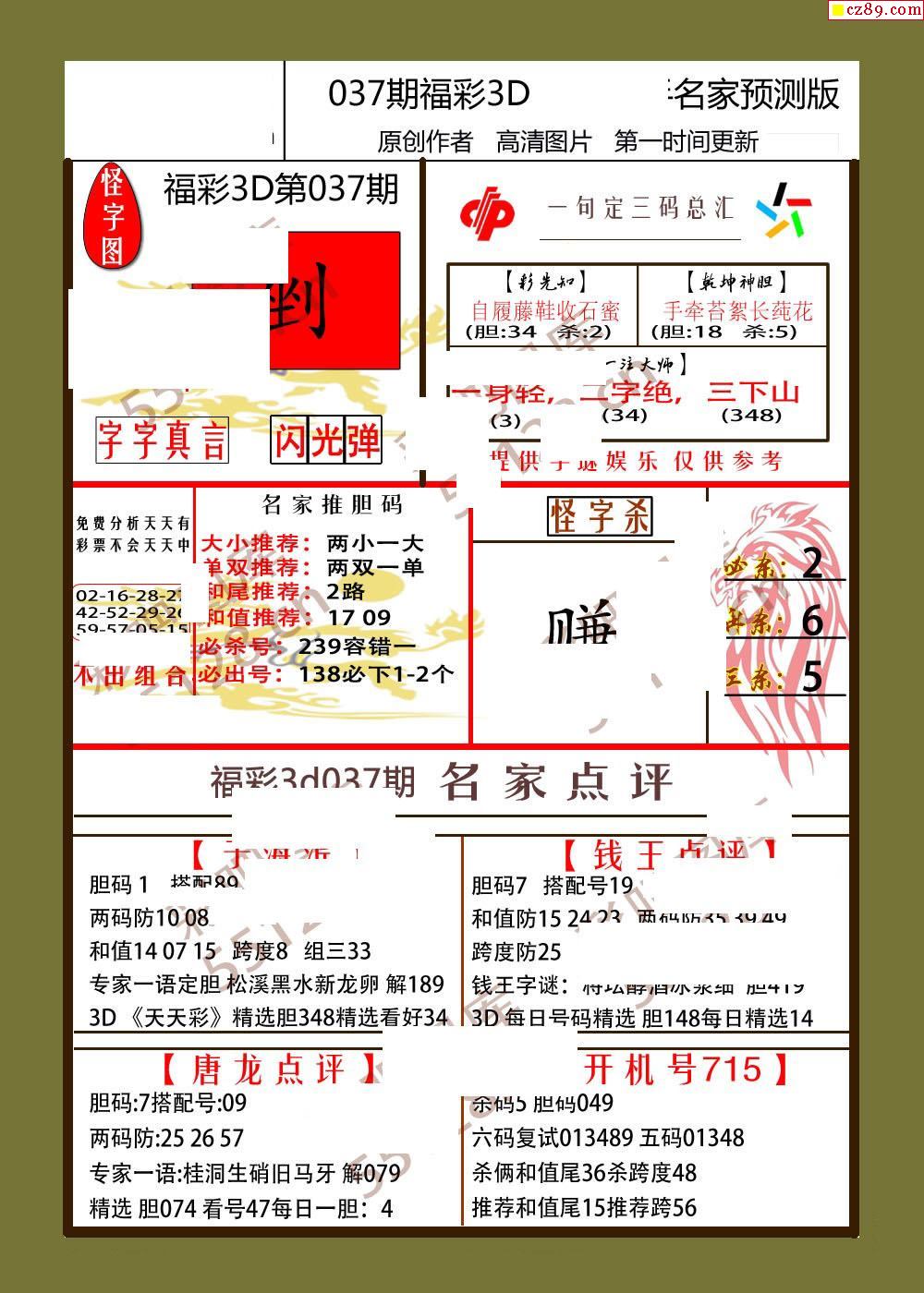 首页 > 福彩3D图谜 > 26年037期福彩3d牛彩名家预测图谜